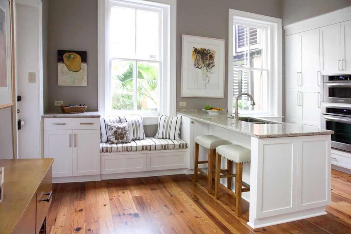 Наличие в кухне панорамных окон с низкими подоконниками не всегда позволяет рационально организовать пространство. Вдоль такого проема невозможно разместить кухонный гарнитур, так как часть его будет перекрыта. Тем не менее, это идеальное место для размещения уютной обеденной зоны. Подоконник можно использовать в качестве скамейки, а при желании превратить его в мягкую лежанку. Добавьте матрас или несколько подушек и удобная тахта готова. Сидя на ней можно принимать пищу, читать или наслаждаться городскими видами. Особенно актуально создание таких зон в эркерах. Форма подоконника идеально подходит для размещения здесь круглого стола, вокруг которого так приятно собираться всей семьей.
