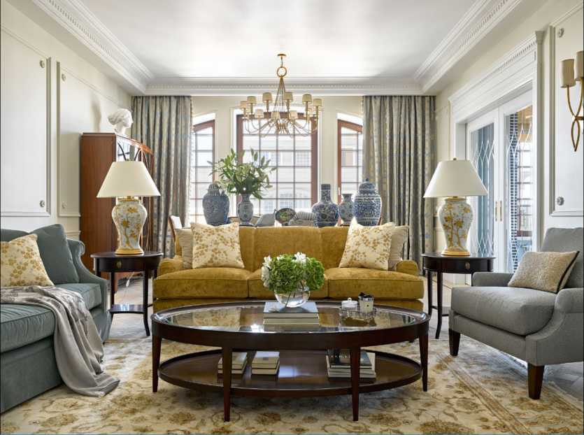 Гостиная, где оконные проемы расположены симметрично на одной стене напротив двери, предлагает в качестве основной идеи дизайнерского решения использовать симметрию. Любой стиль, опирающийся на симметричные детали и конструкции, здесь будет уместен.