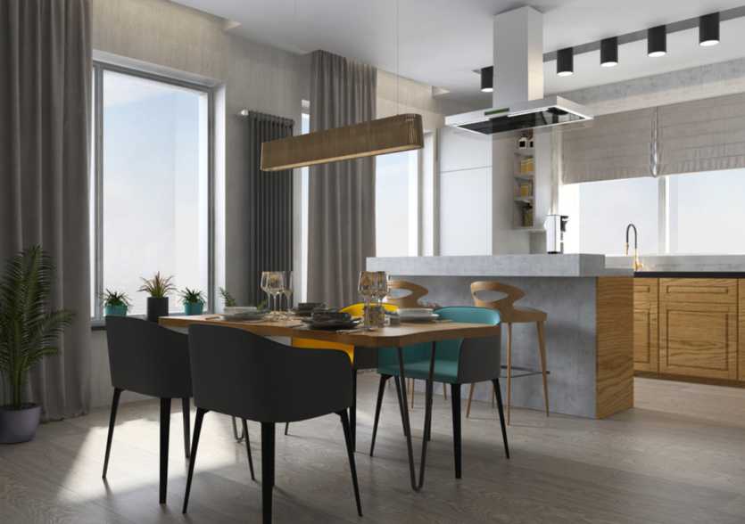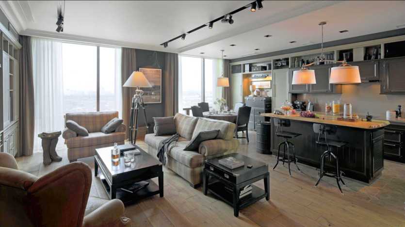 Основной идеей дизайна в комнате с двумя окнами, расположенными на стене напротив дверного проема, выступает симметрия. В обстановку кухни-гостиной впишется любая стилистика, которая предполагает наличие симметричных деталей и конструкций.