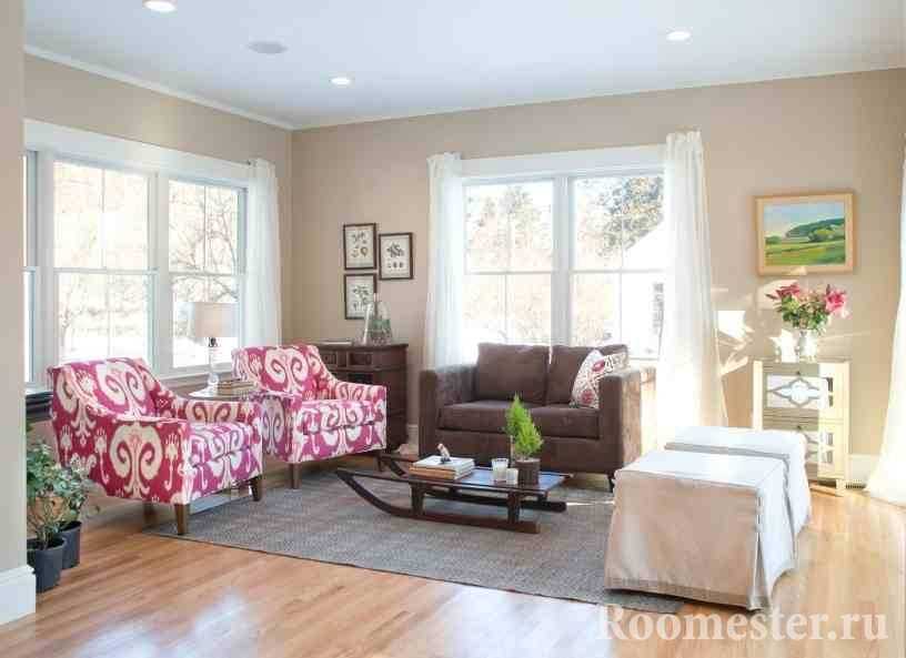 Несложное оформление оконных проёмов в гостиной с двумя окнами