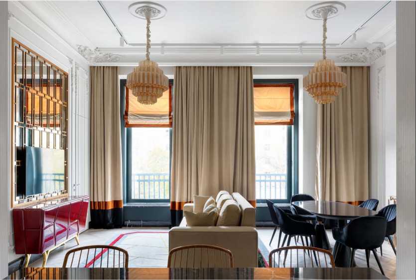 В этом варианте планировки основное действие внутри гостиной разворачивается вдали от оконных конструкций, несущих ограниченную осветительную функцию и роль некоего театрального занавеса, скрывающего вид за окном. Сборчатые французские маркизы, а также сдержанные английские аналоги – это всего лишь обрамление, а не центр комнатной композиции.
