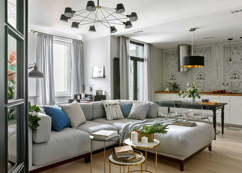 Большинство многоквартирных домов имеют квартиры, где площадь самой большой комнаты составляет 18-20 м2. Обычно это просторное помещение прямоугольной формы с 1 окном на 3 фрамуги. Нередко одно из окон заменяется стеклом балконной двери, но это не может существенно изменить стандартную расстановку мебели при создании интерьера гостиной 20 кв.м.