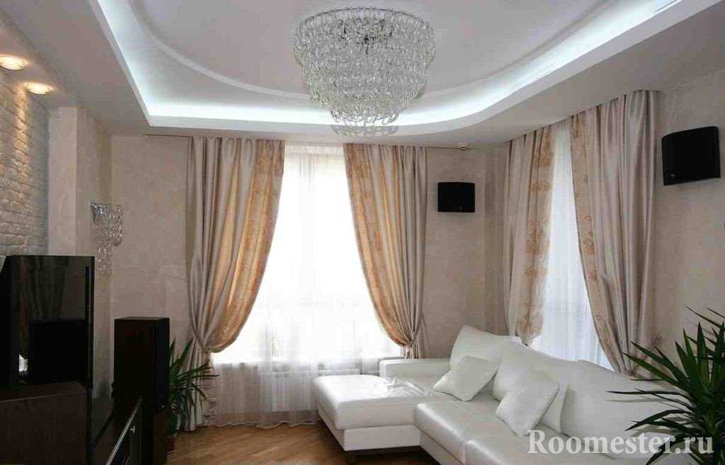 Редко встречается ситуация, когда в гостиной – всего один проем. Если их несколько, шторы можно использовать как полностью одинаковые, так и повторяющиеся через одну, и самые разнообразные по виду (при соблюдении симметрии)