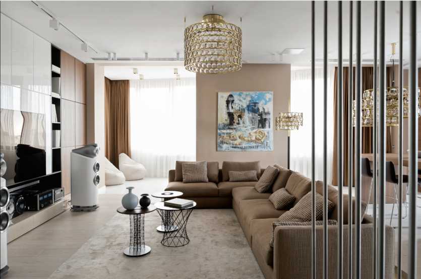 Искусственное освещение и небольшое количество мебели делает гостиную просторнее