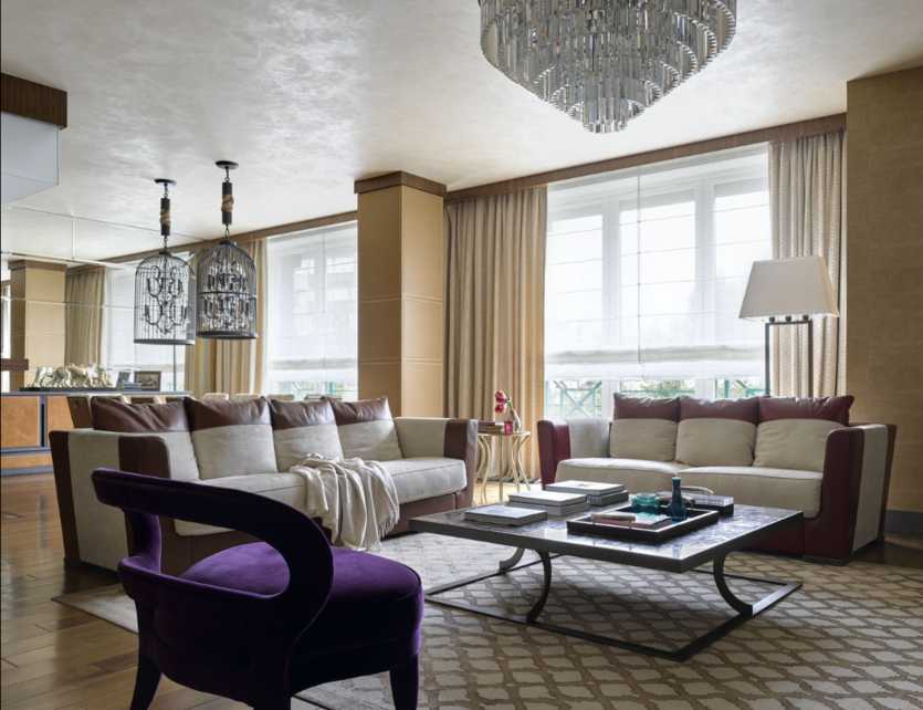 Помимо классических направлений дизайна, наиболее удачными и популярными решениями интерьерной композиции гостиной с двумя окнами являются: