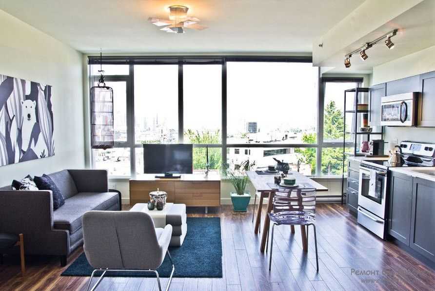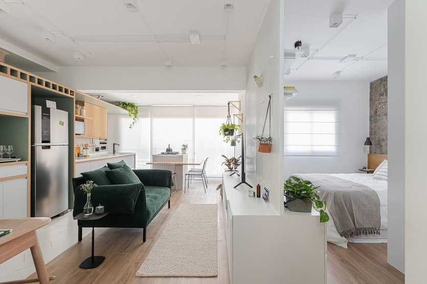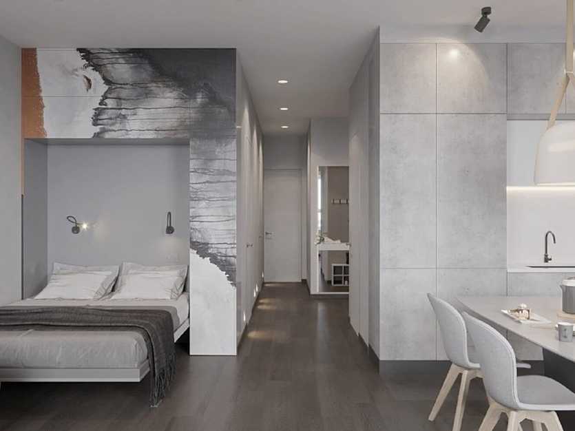 Во-вторых, такое деление на функциональные части требует введения дополнительных элементов обстановки, которые занимают место, вносят свою лепту в общий визуальный шум и увеличивают бюджет на ремонт. Альтернативный вариант — визуальное зонирование кухни и спальни, например: