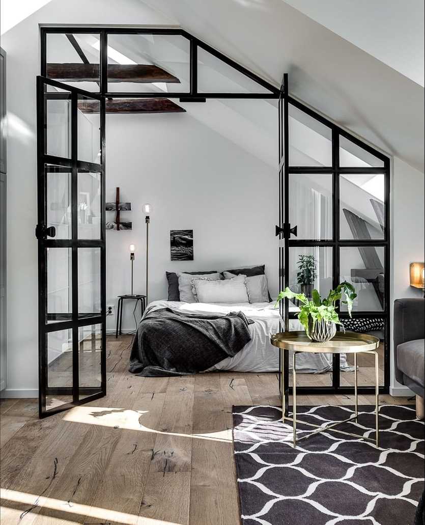 На фото спальное место с кроватью, отделенное прозрачной перегородкой из стекла.