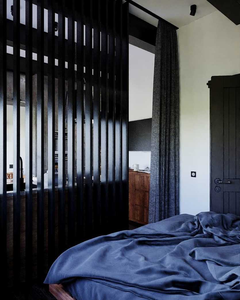 Не менее популярными считаются текстильные зонирующие элементы. Тканевые перегородки прекрасно отделяют спальное место от кухни и предоставляют атмосферу для полноценного отдыха.
