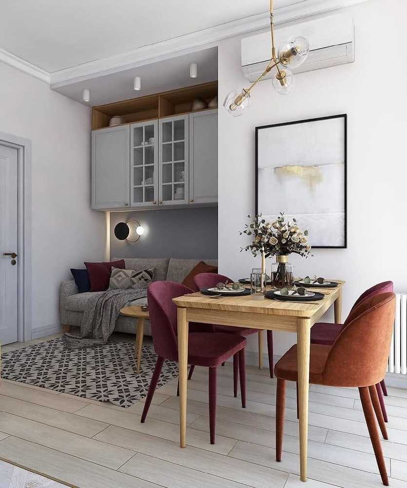 Для отделения рабочей зоны от спального места устанавливают барную стойку или разворачивают диван спинкой к кухне. Если в помещении совсем мало места, подойдет раскладывающийся стол, который в любое время можно убрать.