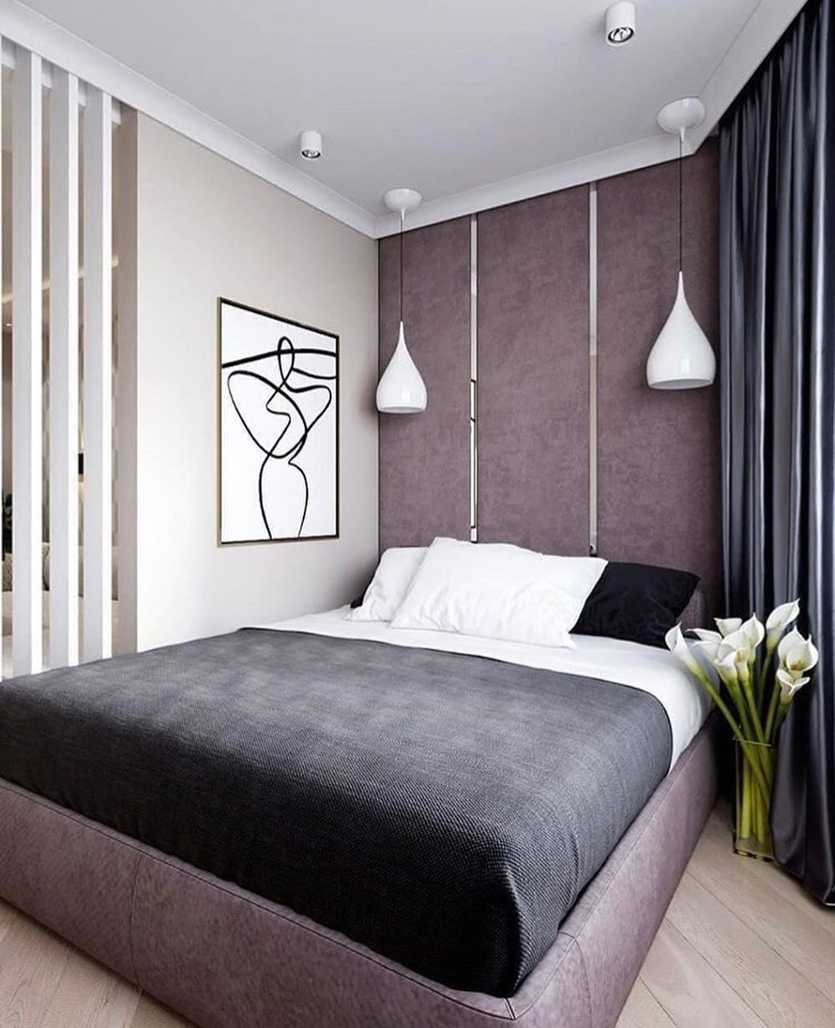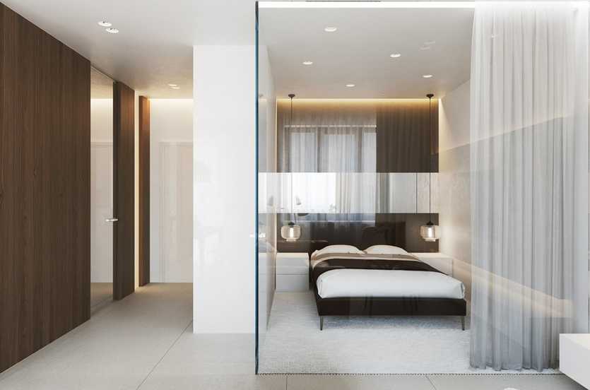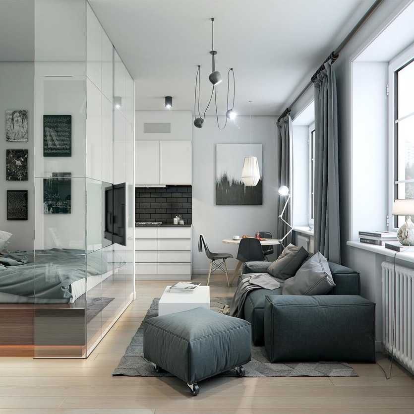 При таком раскладе спальное место отделяется физическими перегородками (часто — стеклянными, для сохранения объема пространства) и получает определенную обособленность. Хотя фактически и спальня, и кухня располагаются в одной комнате (фото ниже демонстрируют несколько примеров такого дизайна).