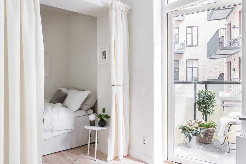 Вариант, обеспечивающий определенную гибкость в конфигурации пространства, — спальня в нише (алькове), дополненная мобильной перегородкой (текстиль, раздвижные двери).