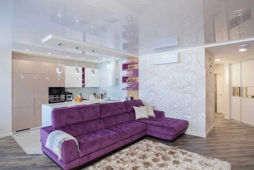 - разным уровнем потолка («перепады» можно сделать при желании на любых потолках — и на оштукатуренных, и на гипсокартонных, и на натяжных);