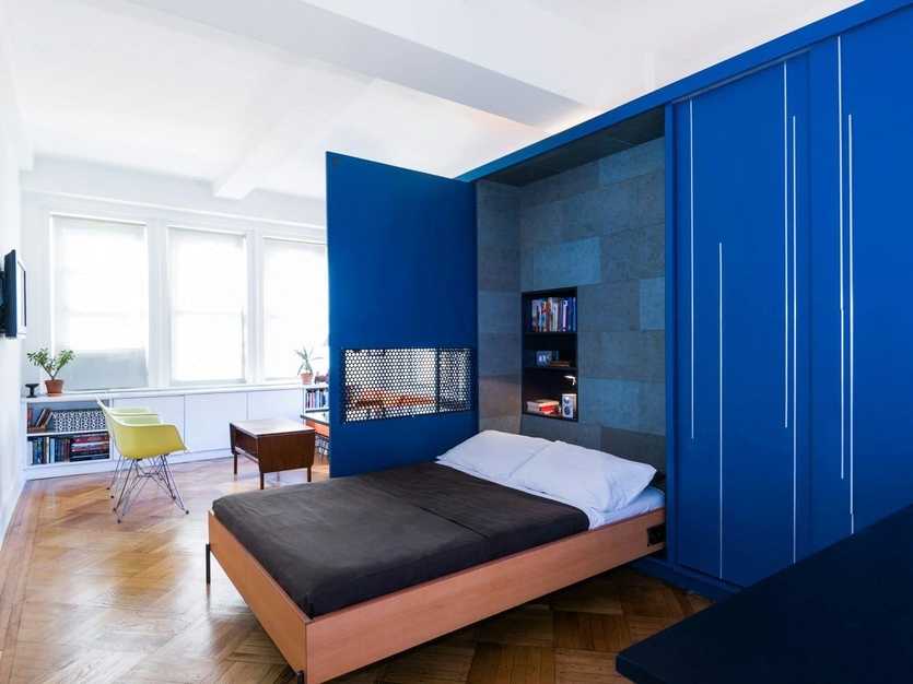 Еще один проверенный вариант физического разделения, позволяющий получить максимальную приватность в случае, когда кухня, гостиная и спальня — в одной комнате, — дизайн-прием «помещение в помещении».