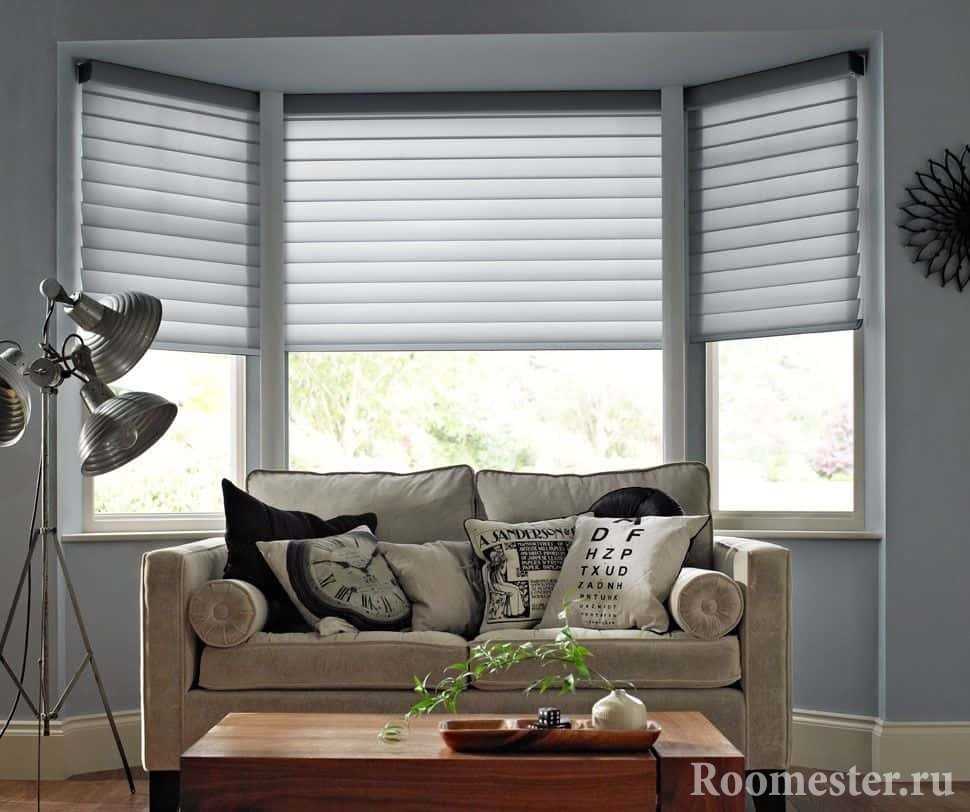 Украсить окна эркера гостиной можно шторами разного типа и кроя. Например, в зале хорошо будут смотреться следующие модели:
