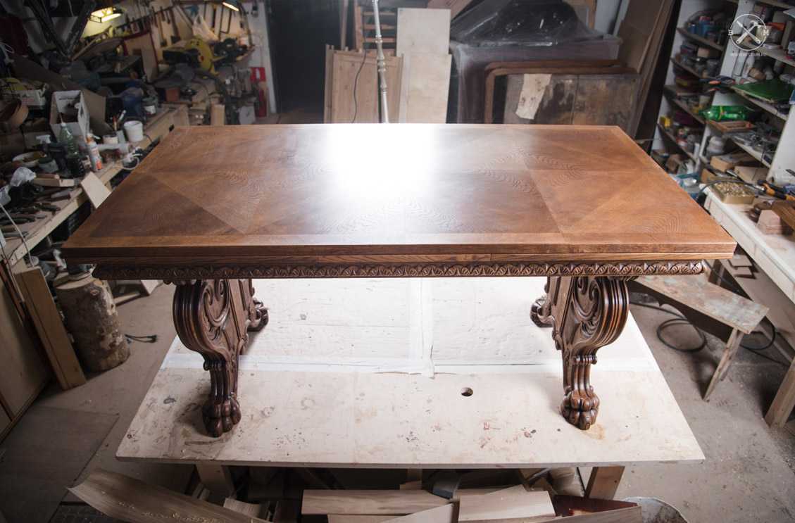 Цель этого процесса — удалить старое лакокрасочное покрытие и подготовить стол к последующему облагораживанию.