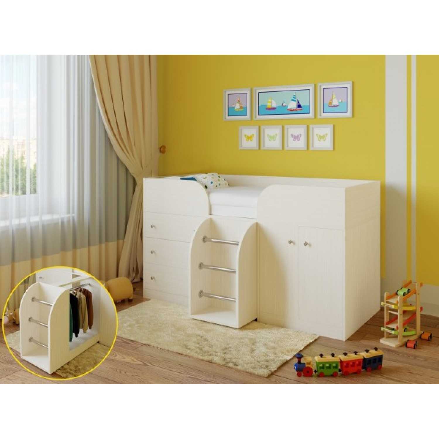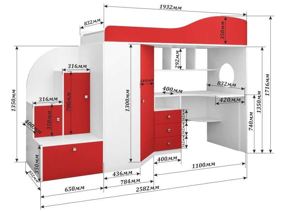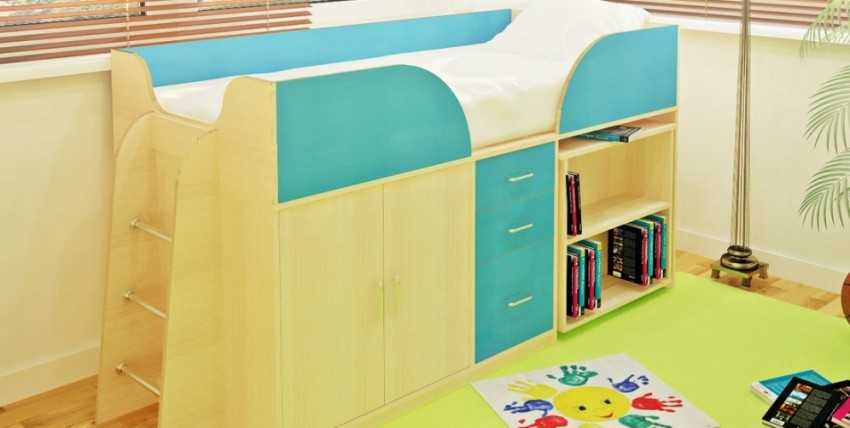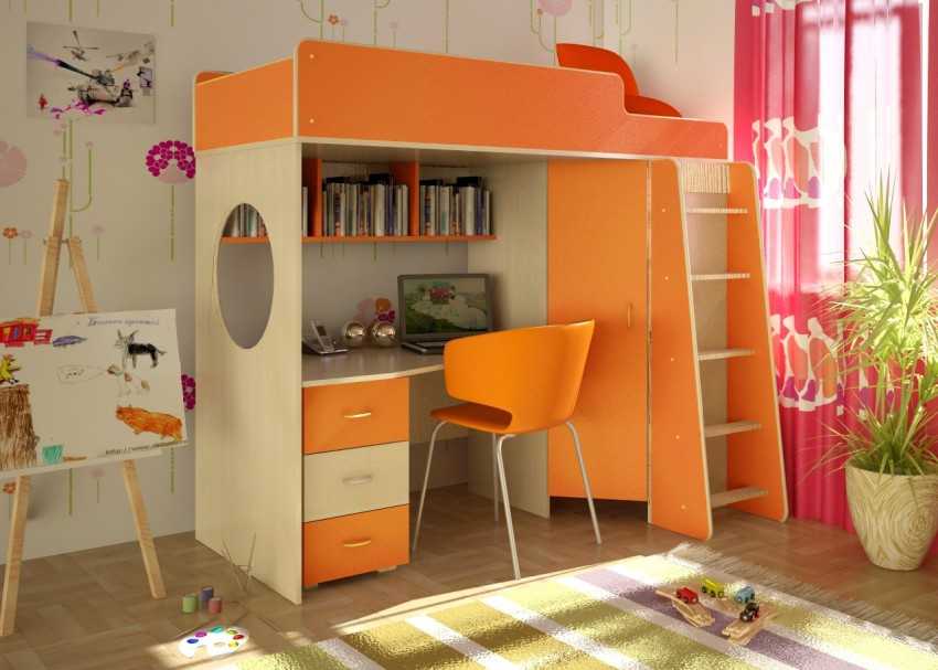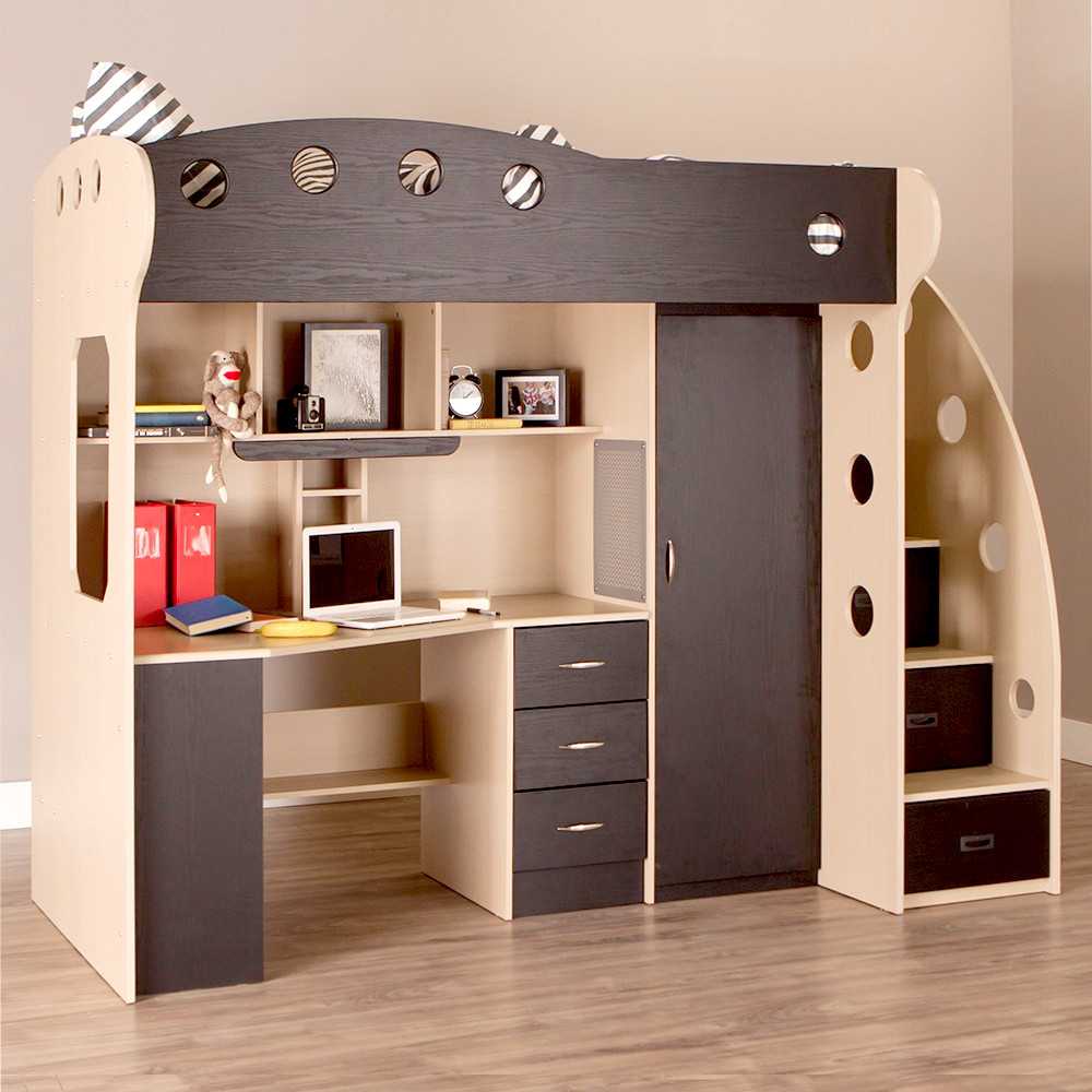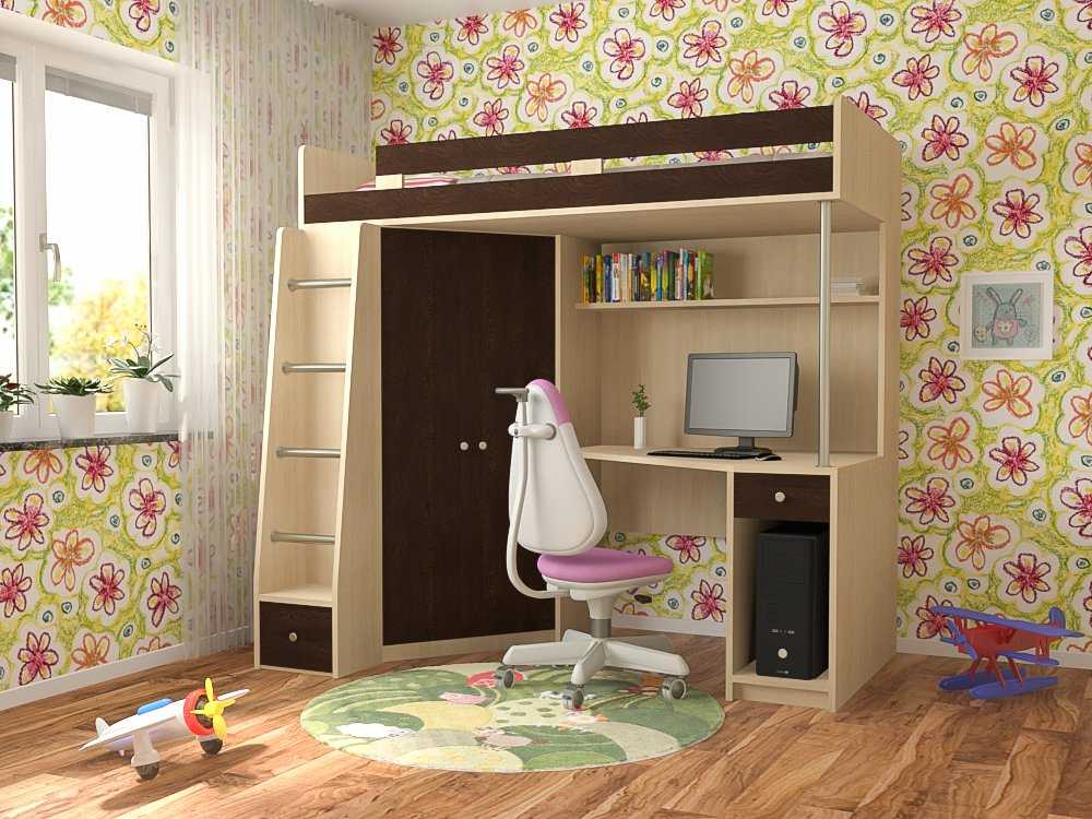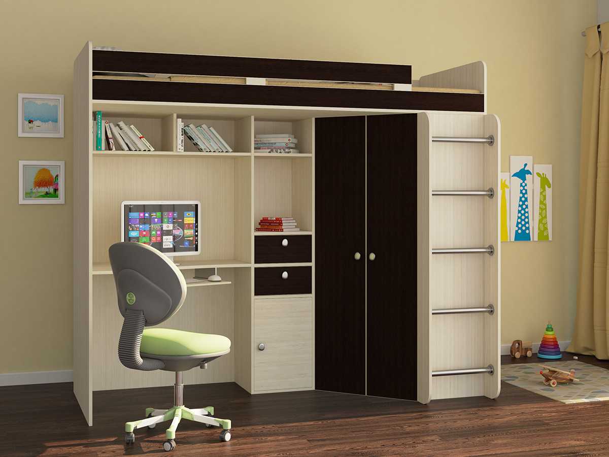 Есть варианты детских кроватей-чердаков со шкафом и столом или с полками. Такая конструкция позволяет сэкономить место, поэтому отлично подходит для однокомнатных или малогабаритных квартир. Но совмещение стола и шкафа может мешать ребенку полноценно заниматься.