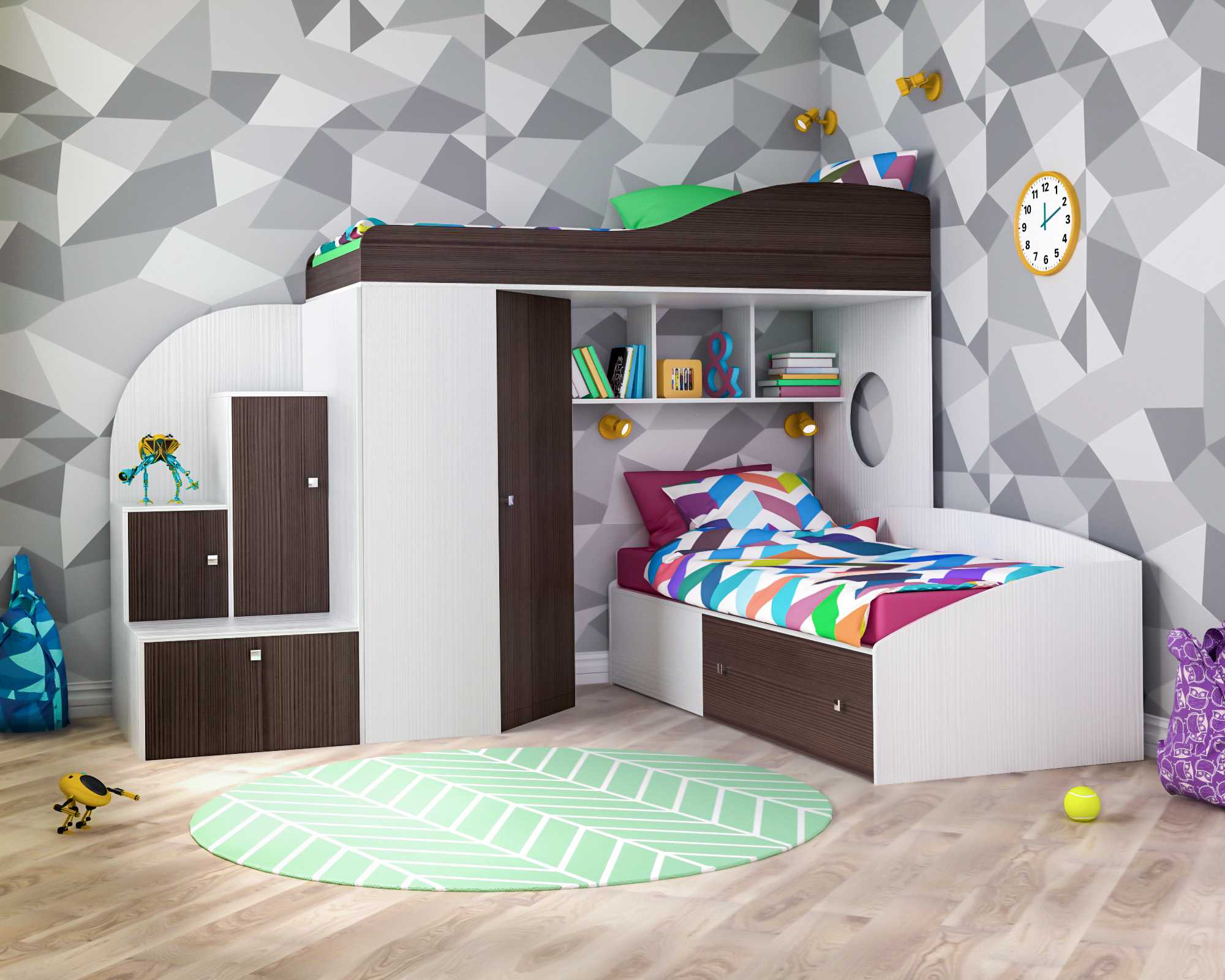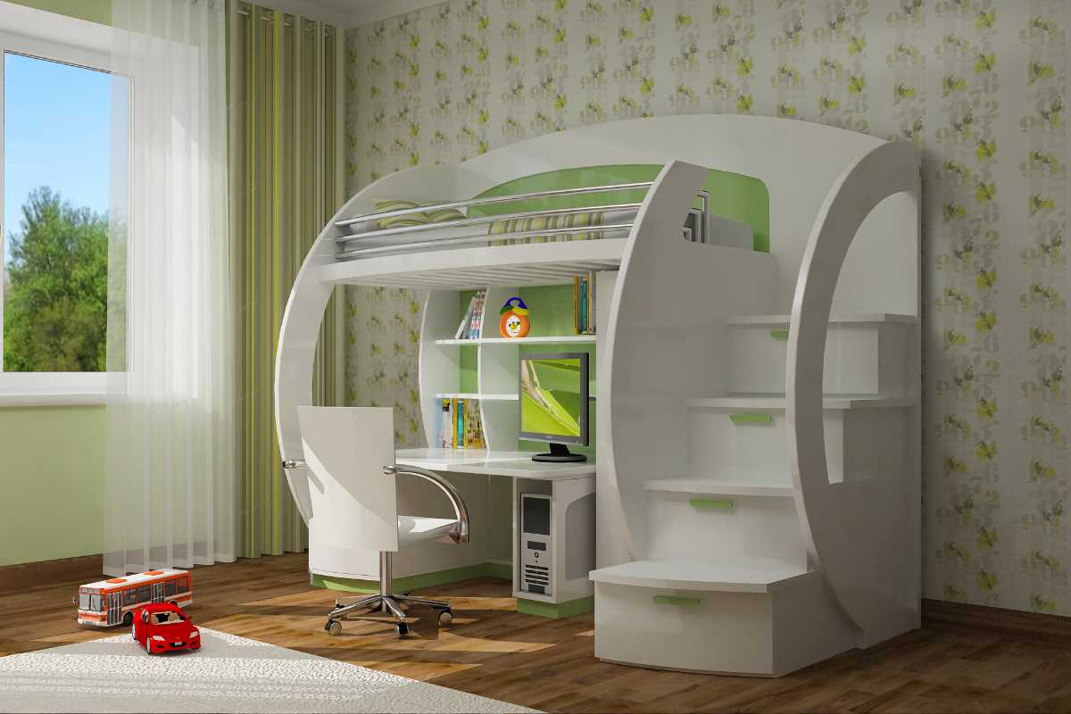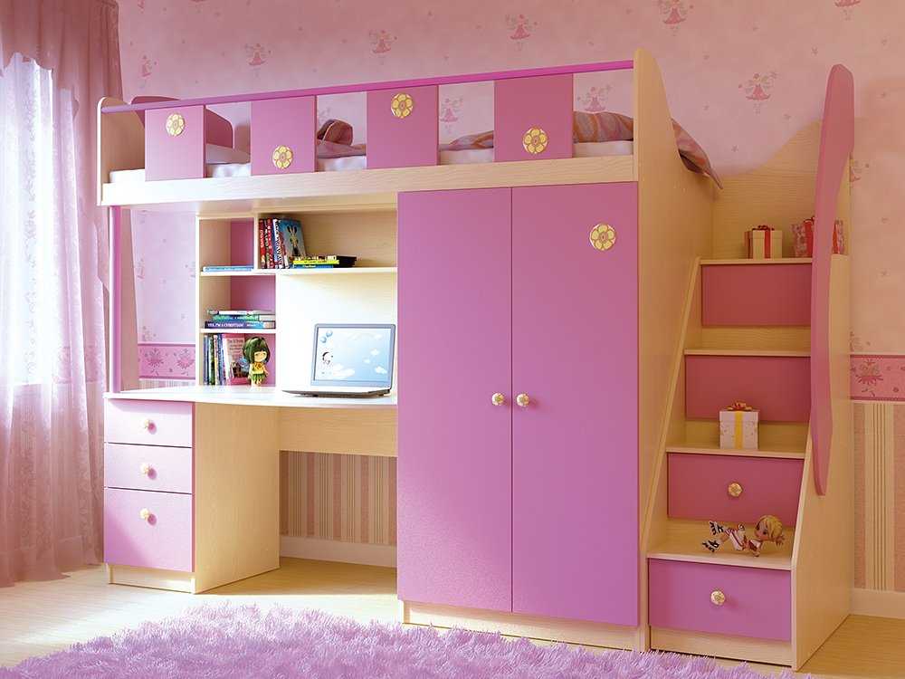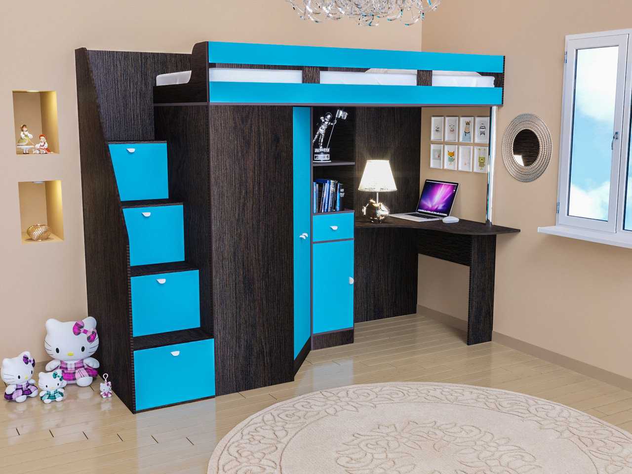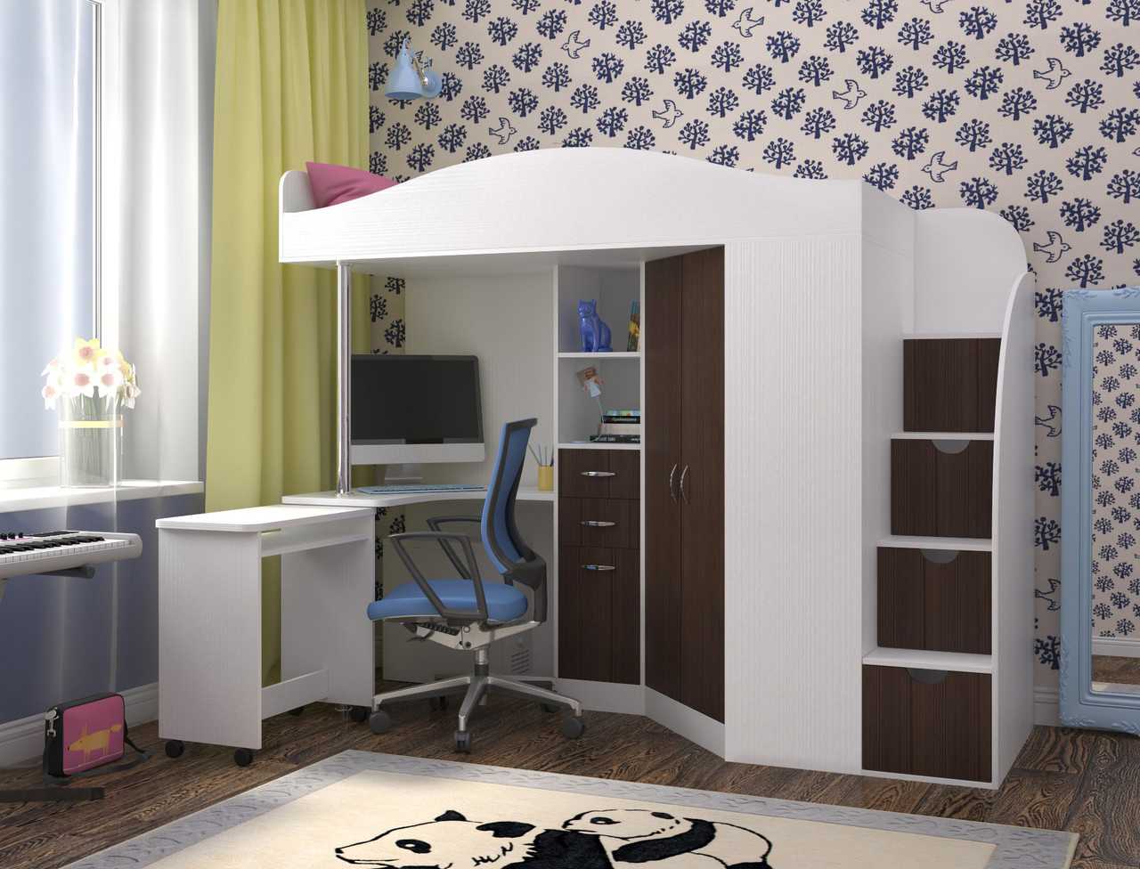 Во многих случаях данная модель выступает, спасение при небольшой жилплощади. Данное решение позволяет разместить сразу все, что необходимо ребенку в небольшом пространстве детской комнаты.