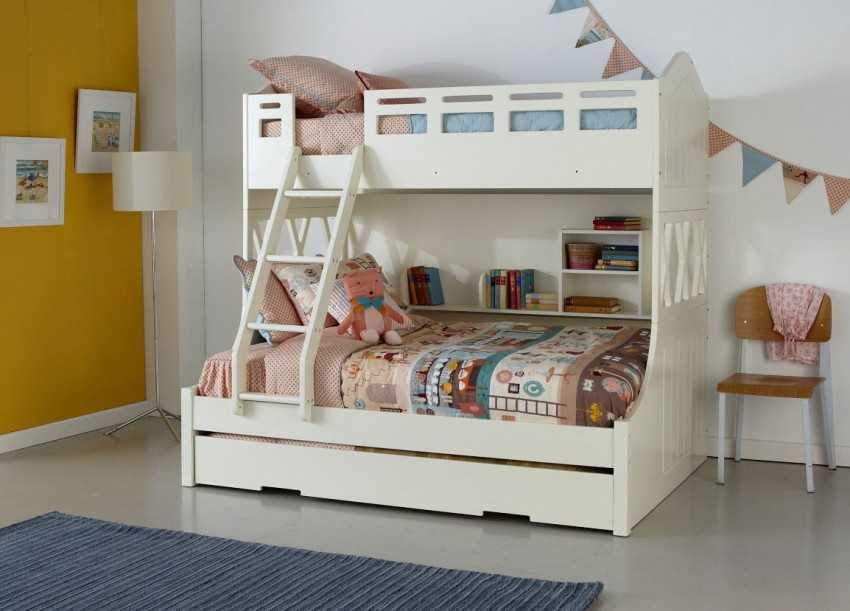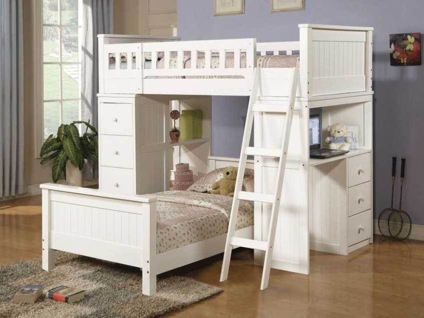 Например, вверху обычное спальное место, а снизу небольшой стол или шкаф и кровать, которая расположена перпендикулярно верхней кровати. Другой вариант – вверху кровать для ребенка постарше, внизу – для ребенка помладше. Ложе в таком варианте конструкции будет разного размера.