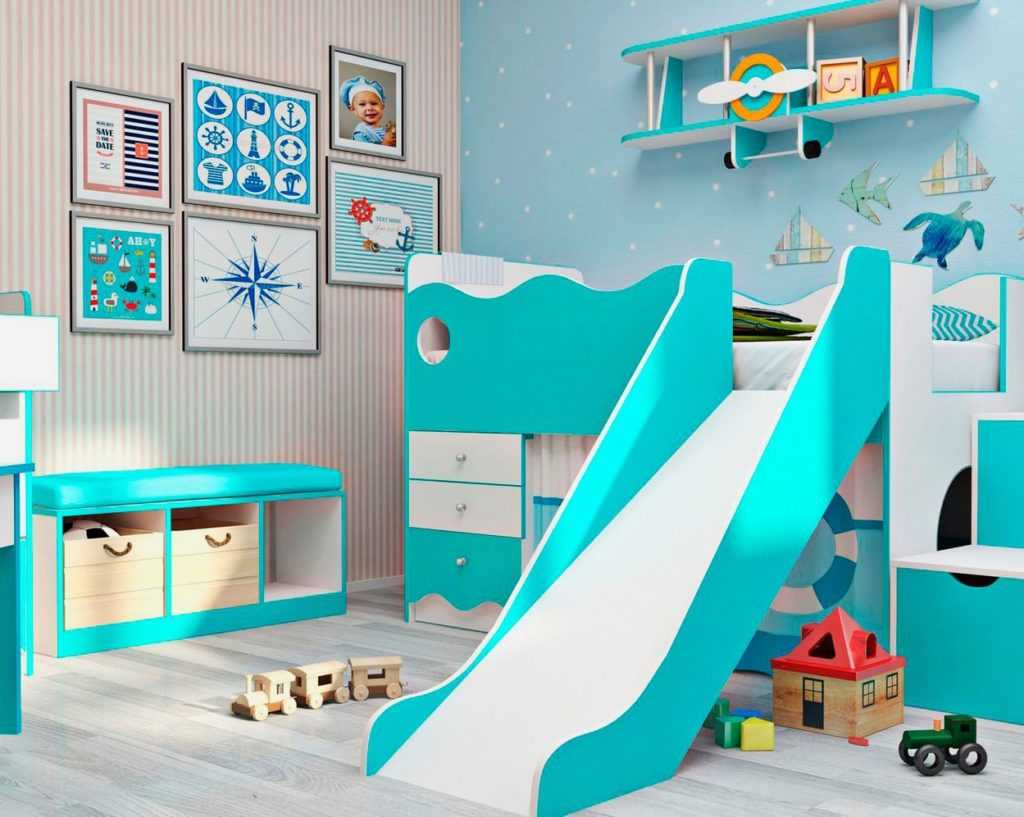 - Морская – бело-красно-синее оформление детской комнаты подойдет не только для мальчика, но и для девочки. Элементы декора кровати чердака могут быть в виде волны, якоря;