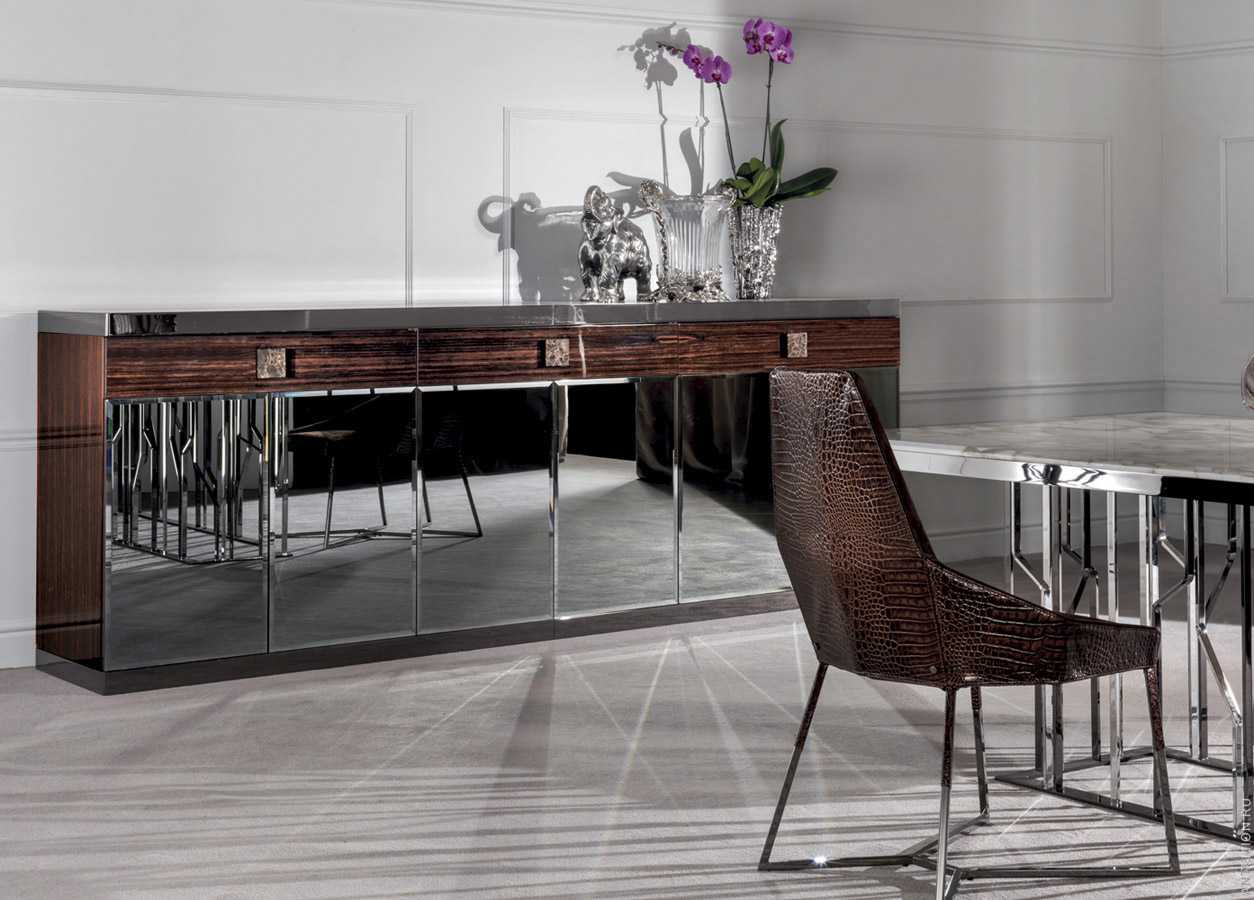 Зеркальные разновидности примечательны тем, что они способны визуально менять пространство любой комнаты, будь то маленькая гостиная или просторный зал. Они могут иметь подвесное зеркало, либо зеркальные поверхности фасада и даже ножек.