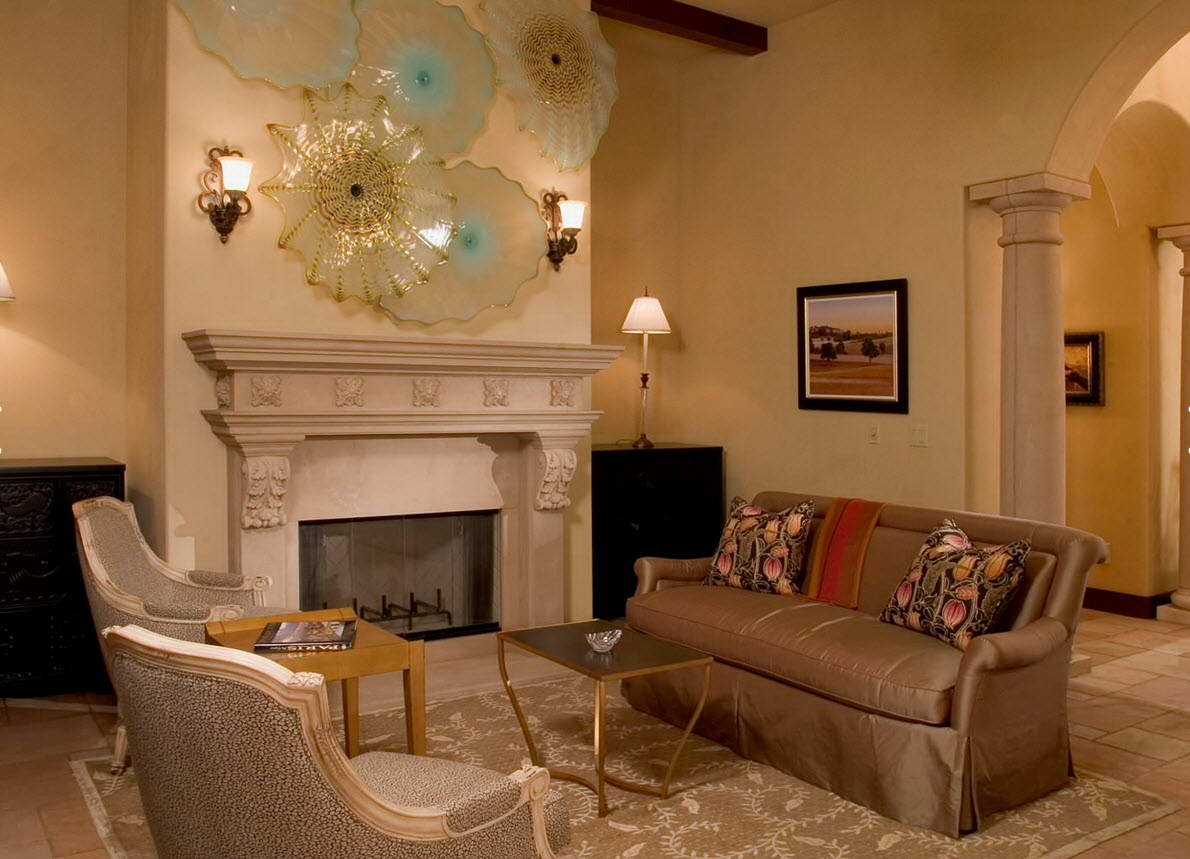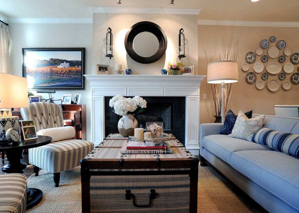 Если в вашей гостиной есть работающий или импровизированный камин, то пространство над ним буквально нуждается в украшении. Как правило, эта зона весьма обширна и сможет уместить очень крупные экземпляры настенного декора или целую композицию тарелок разных размеров и форм. Стеклянные предметы декора вычурной формы смотрятся роскошно и привносят оригинальность в традиционный интерьер гостиной.