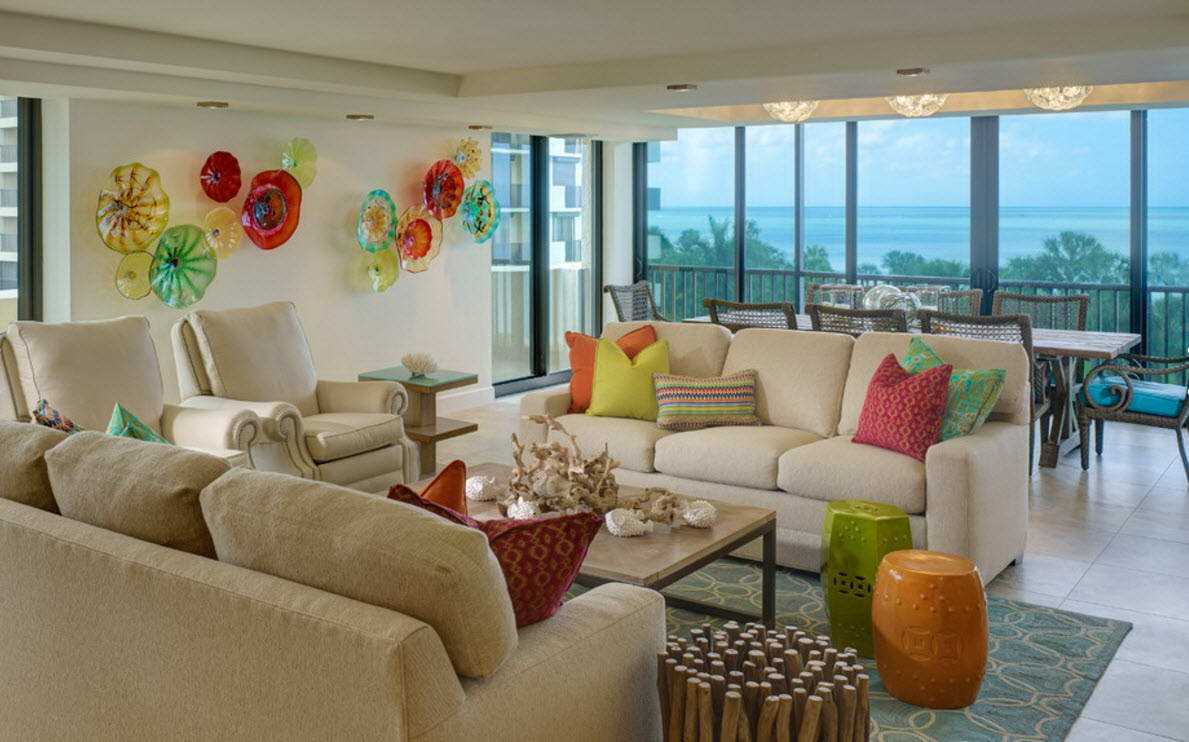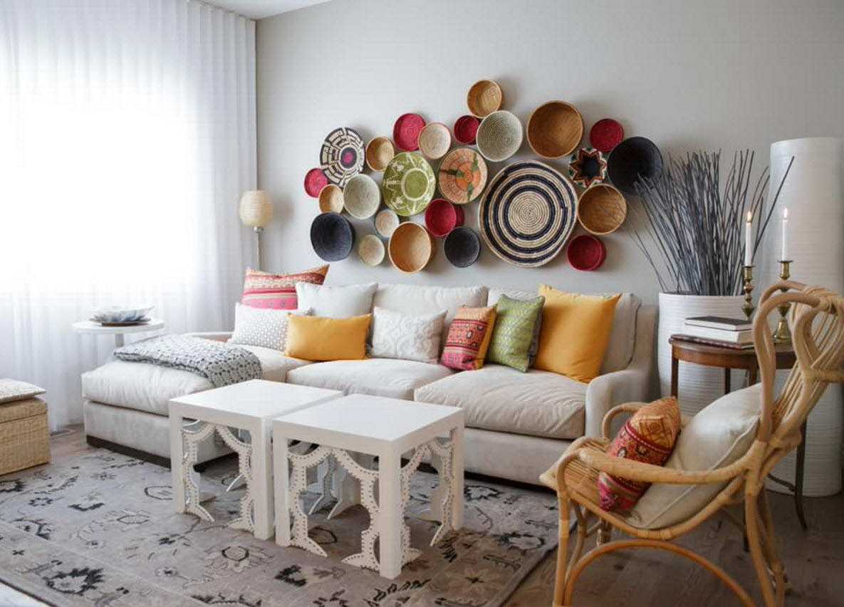 - Тарелочки контрастных цветов: в бежевой комнате крепятся ярко-красные тарелки.