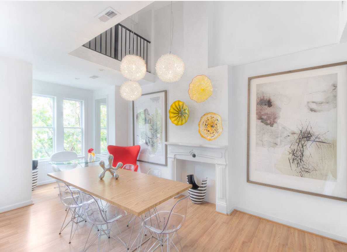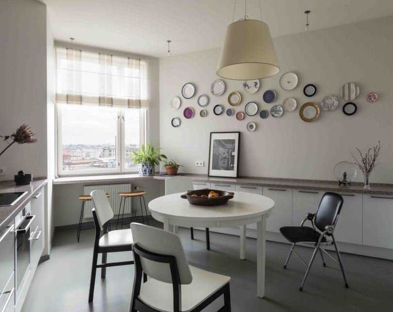 Крупный настенный декор необычной формы и расцветки, который даже сложно назвать тарелками, способен стать акцентным элементом интерьера. В практически белом помещении столовой яркие, колоритные предметы декора смотрятся «звездами» дизайна.