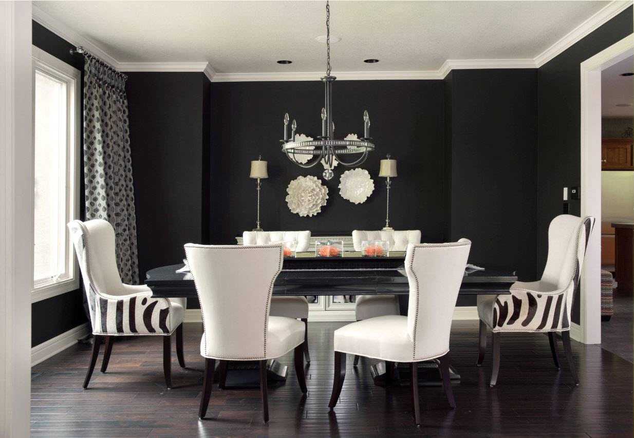 На темном фоне столовой светлый настенный декор смотрится особенно эффектно, выразительно. Большие белоснежные цветы привнесли нотки романтизма в строгий интерьер черно-белой столовой.