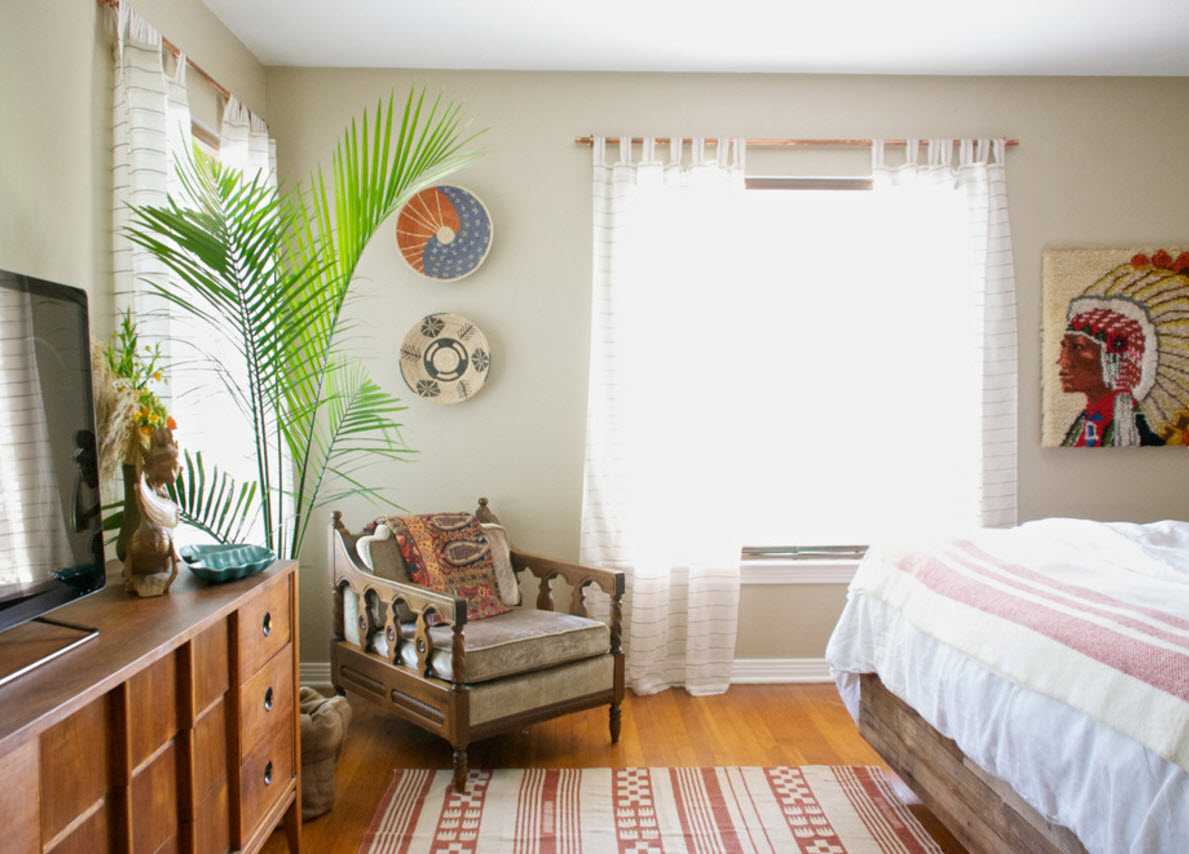Тарелки в этническом стиле, расписанные на керамике или плетеные из разноцветных веревок – отличное украшение для оригинального дизайна спального помещения.