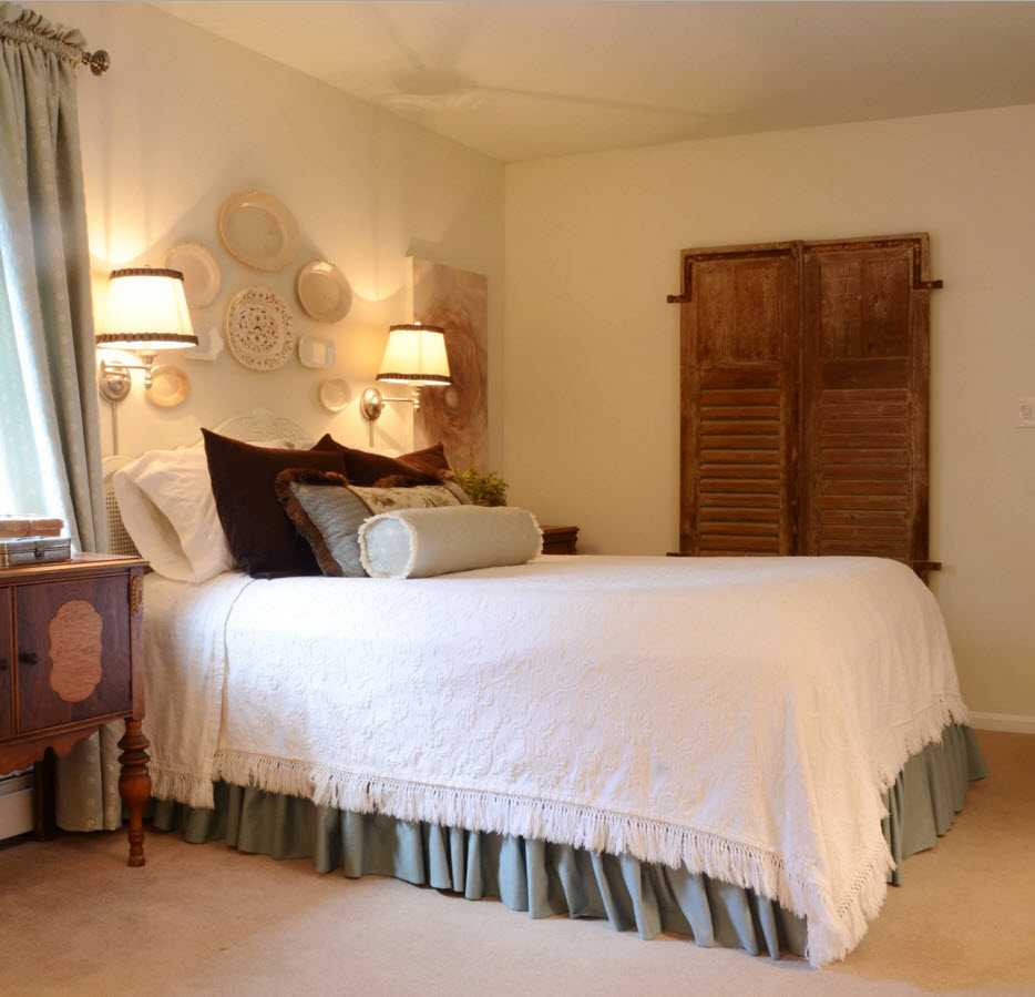 Согласитесь, что встретить тарелки в качестве настенного декора спальной комнаты не часто удается. Тем интереснее и оригинальнее может получиться интерьер. Например, спальня, оформленная в стиле шебби шик или винтаж, может быть органично украшена старинными тарелками из коллекции вашей бабушки или купленными вами на блошиных рынках и в антикварных магазинах предметами декоративной посуды.