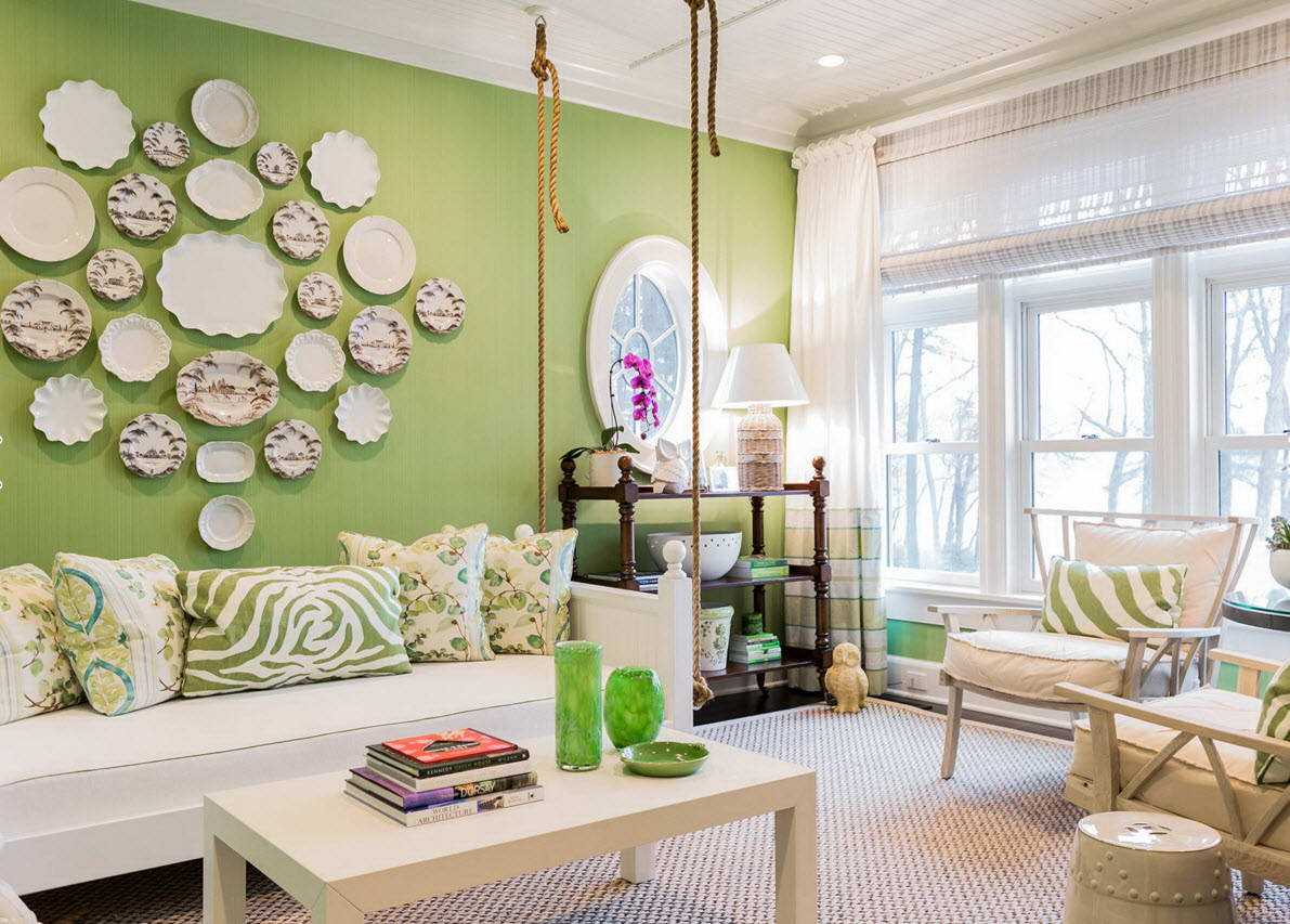 Для того чтобы разукрасить интерьер в спокойной фисташково-белой или коричнево-бежевой гамме можно шторы, подушки и тарелки использовать одним цветом и добавить в этот интерьер другие яркие цвета. Простор для творчества – приобрести белые тарелки, а затем раскрасить их в тона, которые лучше всего впишутся в эту комнату.