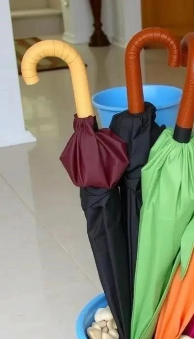 Создание зонтницы своими руками – это экономичное и приятное дизайнерское решение, которое позволяет придать интерьеру уникальность. Например, можно переделать старую садовую урну или использовать джутовую верёвку и старую вазу (широкую трубу). Металлическую посуду можно покрасить, а отрезки труб с заглушками на дне скрепить кожаным ремнём. Плетёная корзина или даже декоративная клетка для птиц также станут оригинальными и практичными элементами для хранения зонтов.
