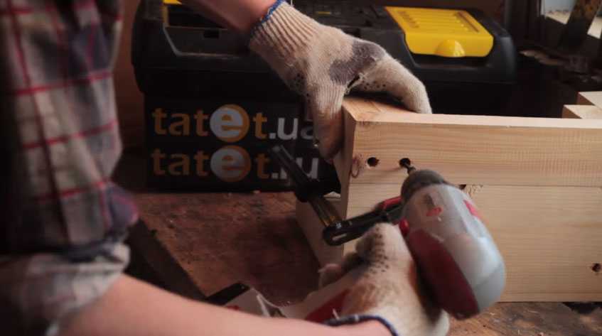 - Перекладина шурупами прикручивается к маленьким ножкам, крепится передняя царга и ступени.