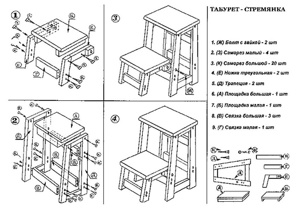 Сборка высокого табурета-стремянки выполняется в три этапа: