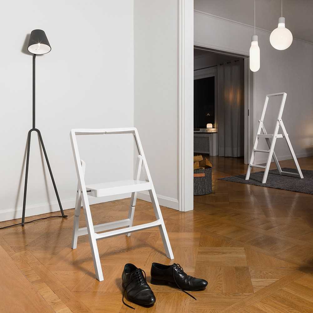 Стул-стремянка может быть вписана практически в любой стиль помещения, главное – правильно подобрать данный атрибут.