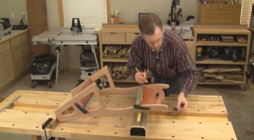 Делаете для соединительных шпонок пазы (для соединения шкантами просверлите под них отверстия). Места стыковки ножек с другими элементами срежьте под углом, используя электролобзик. Необходимо округлить углы у ножек, что убережёт их при увеличенной нагрузке от скалывания. Теперь на очереди царги (планки, на которых крепится крышка стула). Их выпиливают и тоже у верхних торцов делают скашивание с углом восемьдесят градусов.