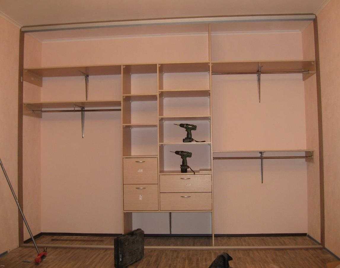 Подобный тип изделий изготавливается значительно проще, так как купе бывают разные. В некоторых из них, затраты сил, времени и материалов уйдут на создание только внутренностей полочек, тумбочек. Это свойственно и бескаркасному типу шкаф купе встроенный из фанеры своими руками его тоже можно произвести. Для работы над этим типом и другими, также нельзя пропускать все подготовительные шаги, в том числе и создание чертежей.
