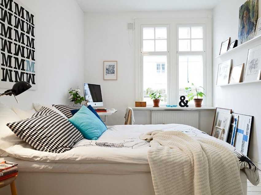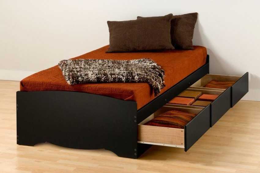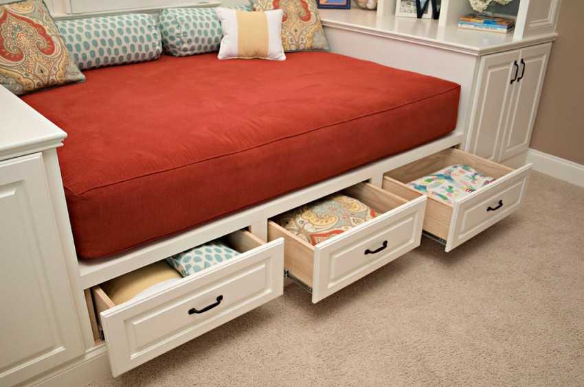 Если спальная комната небольших размеров, то собственноручно получится создать эргономичное и компактное спальное место. Лучше всего, когда кровать будет с раздвижным механизмом, который позволит собирать ее в маленький и компактный диван после сна. Либо оснастить спальное ложе выдвижными ящиками, в которых поместятся пастельное белье, сезонные вещи или другие предметы, редко используемые.