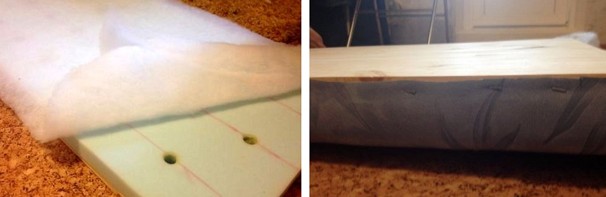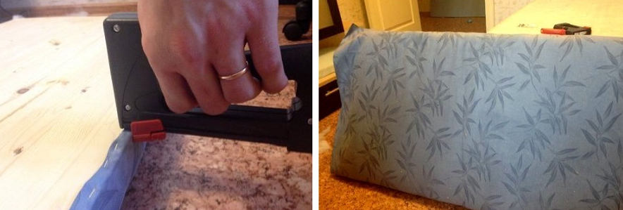 Крепление поролона и ткани осуществляется с помощью строительного степлера. Сначала крепится поролон. Вместо толстого обивочного поролона можно воспользоваться несколькими слоями более тонкого материала.