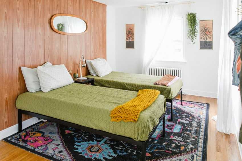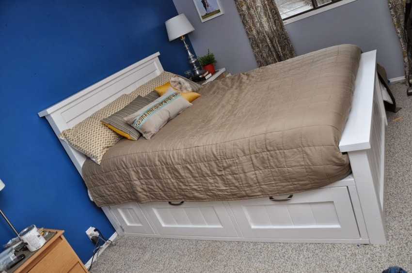 Этот хитрый проект превращает обычную пружинную кровать в кровать платформу. Если у вас уже есть кровать для начала, то не придется тратить слишком много времени, чтобы она выглядела так же великолепно и привлекательно, как эта. Идея в том, чтобы обтянуть старый каркас кровати материалом, сделать мягкую обивку и приделать стильные ножки. Как автор проекта претворял эту идею в жизнь, можете прочитать в инструкции на сайте. И, конечно, несколько наглядных пошаговых фото.