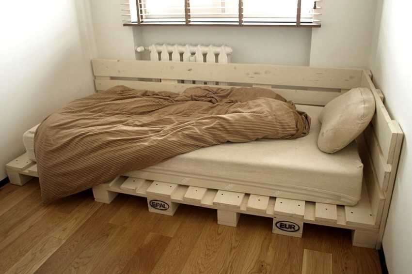 Когда хочется сделать большую кровать, но не хватает средств, дизайнеры предлагают воспользоваться деревянными паллетами. Для двуспальной кровати понадобится 6-8 паллетов, которые скрепляются друг с другом в прямоугольной форме, а сверху кладётся обычный матрас, и кровать готова.