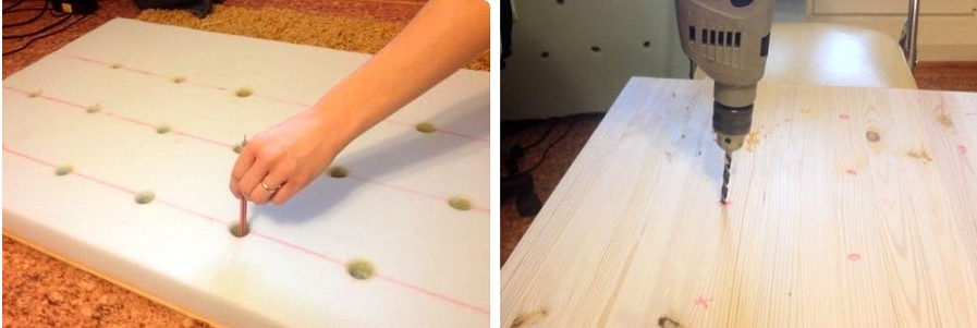 С одной стороны планок просверлите дырки под саморезы, это надо обязательно делать, поскольку при вкручивании метизов без предварительной подготовки фанера расколется. С другой стороны сделайте небольшие углубления, здесь будут вкручены саморезы с большими шайбами.
