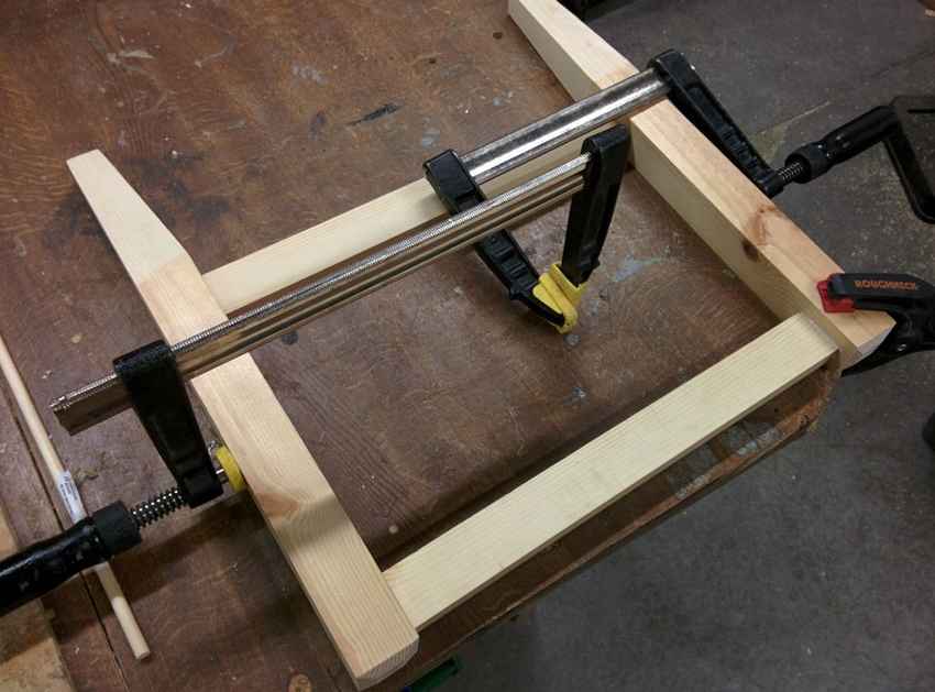 - Подлокотники и заднюю подпорку для них прикрепите друг к другу, зажмите их при помощи струбцин.