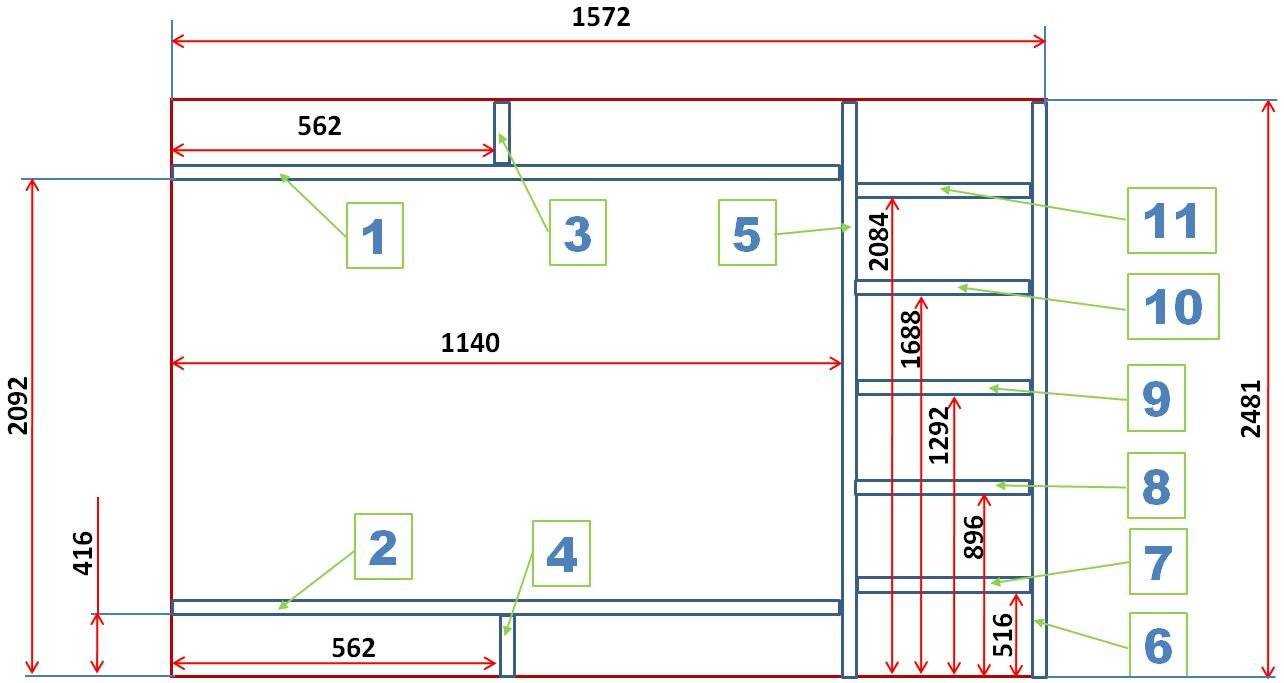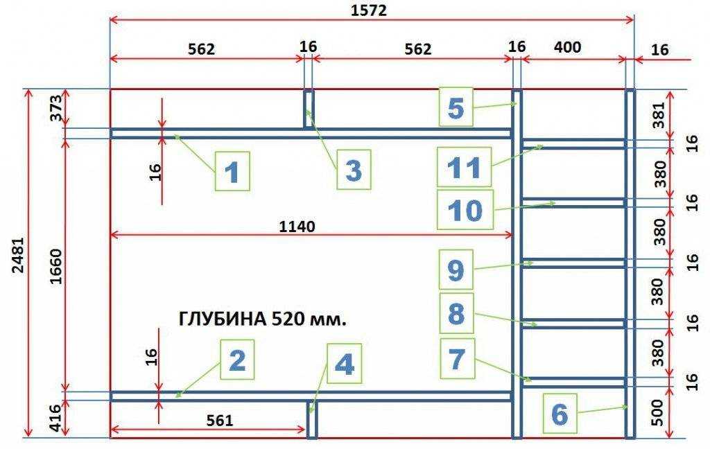 Здесь будет рассмотрен процесс изготовления шкафа глубиной 520 мм, высотой 2 480 мм и шириной 1572 мм (рассчитывается по правилу «золотого сечения» с учётом высоты 2 480/1,62=1 531).