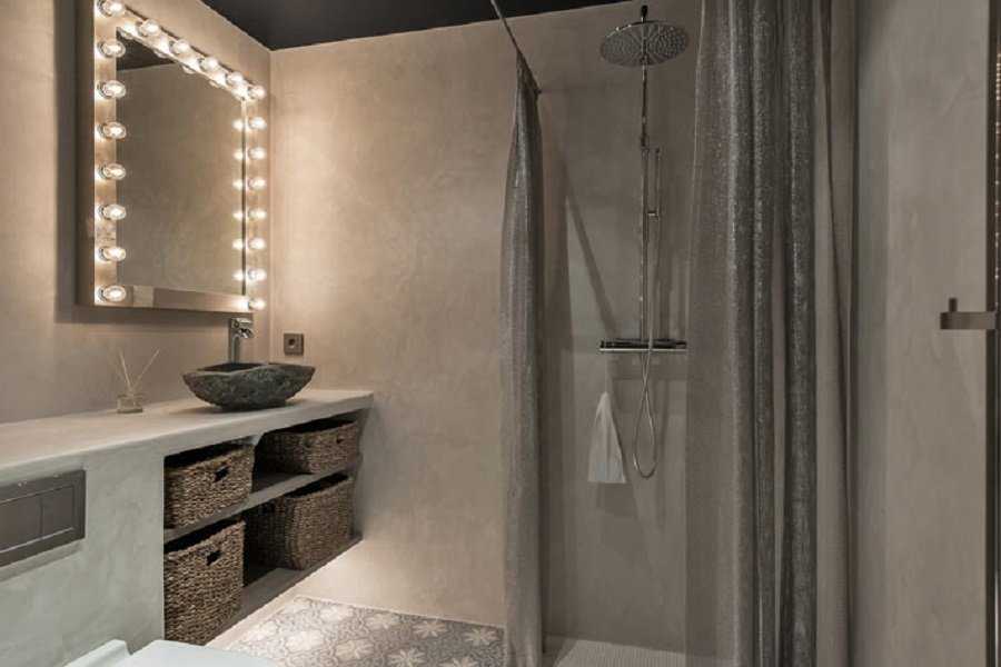 Ограниченные размеры помещения требуют особого подхода к размещению каких либо предметов. Любые выступающие детали будут доставлять неудобства. Поэтому светильники устанавливать лучше скрытые, если позволяют возможности в потолке над зеркалом или в шкафчик в которое оно вмонтировано.