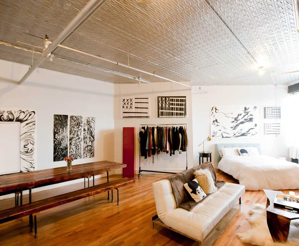 Интересное решение в дизайне маленьких квартир — обустройство дощатого возвышения в 80-100 см над полом. Свободное пространство под такой «сценой» удобно использовать для хранения зимней одежды, постельных принадлежностей, обуви, игрушек, колясок. Также под подиумом можно установить выдвижную кровать или спрятать туда любую другую трансформирующаяся мебель.