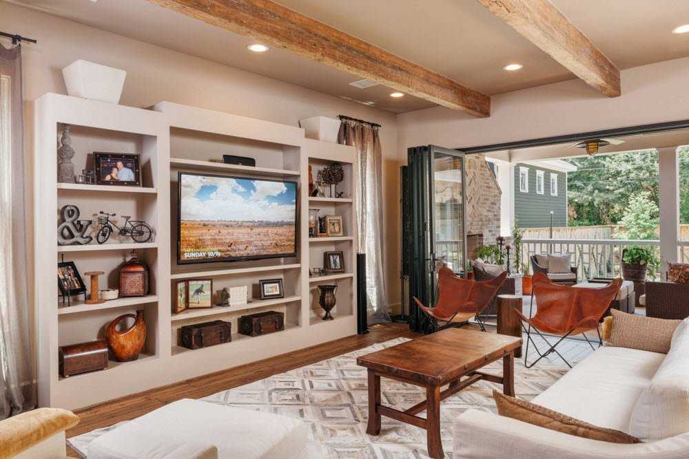 Кантри – это доминирование светлых солнечных оттенков, натурального текстиля с растительным орнаментом, рюшей, завязочек, мягких чехлов на стульях и подушечек на диванах. Обязательно найдите на барахолке какой-нибудь старый комод или журнальный столик с изогнутыми ножками, обновите его на свое усмотрение и сделайте центром интерьера. Живые цветы в вазах дополнят образ уютной деревенской гостиной.