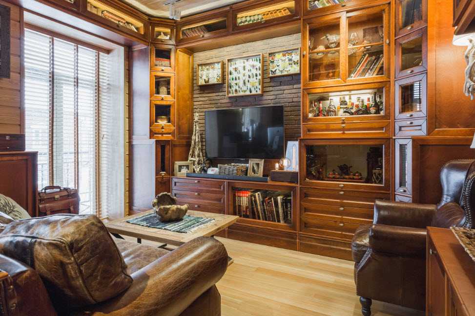 Если на одной торцевой стене находится окно, на противоположной ей стене можно встроить шкаф купе, который визуально сократит длину комнаты. Если помещение узкое и, к тому же, его площадь меньше 18 метров, не стоит использовать большое количество корпусной мебели. Так, вместо привычной «стенки» можно установить тумбу под ТВ напротив дивана и подвесить несколько узких полочек. Такая гостиная должна быть оборудована минимальным количеством предметов мебели с наибольшей функциональностью.
