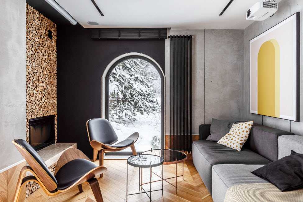 Современный. Отличается функциональностью и удобством. Здесь гармонично существуют дерево, бетон, стекло. Графические детали на стенах делают интерьер интересным, а диванные подушки, коврик и плед смягчают его.