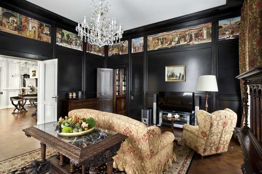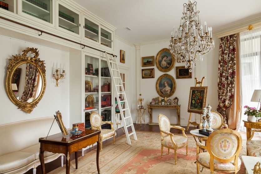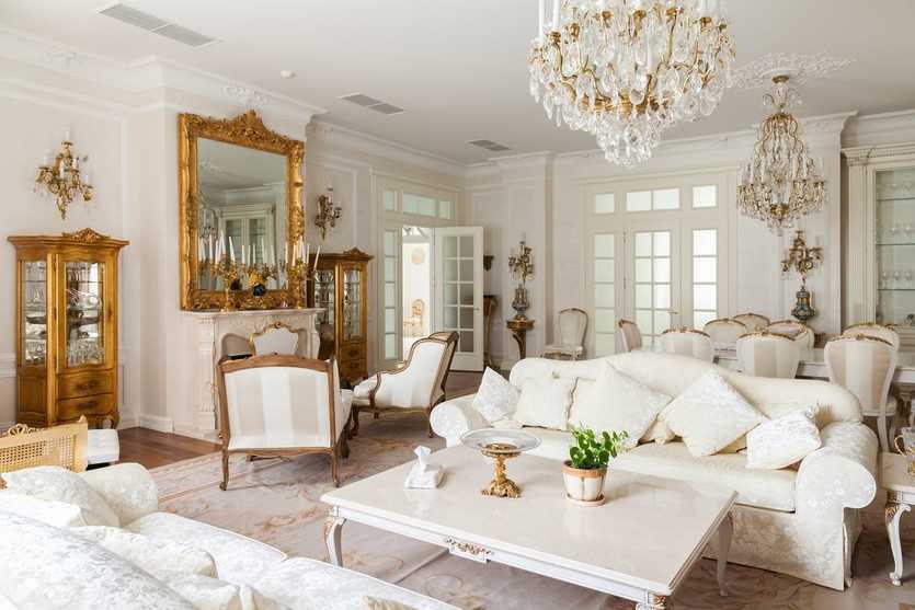 Стены украшают картинами в красивых позолоченных рамах с изображением классических сюжетов картин известных художников. Здесь же располагают портреты обитателей дома и их родственников, но только живописные. Разные фотопринты и постеры в классическом интерьере неуместны. Традиционным предметом гостиной является большое зеркало, обрамлённое изысканной резной рамой.